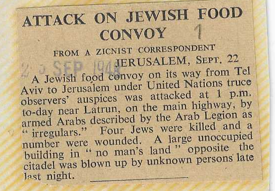A Jewish food convoy on its way from Tel Aviv to Jerusalem under United Nations truce observers’ auspices was attacked at 1 p.m. to-day near Latrun, on the main highway, by armed Arabs described by the Arab Legion as “irregulars.” Four Jews were killed and a number were wounded. A large unoccupied building in “no man’s land” opposite the citadel was blown up by unknown persons late last night.