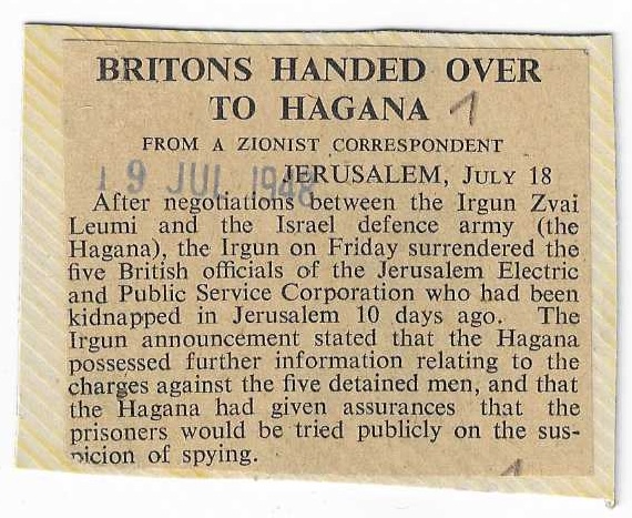 After negotiations between the Irgun Zvai Leumi and the Israel defence army (the Hagana), the Irgun on Friday surrendered the five British officials of the Jerusalem Electric and Public Service Corporation who had been kidnapped in Jerusalem 10 days ago. The Irgun announcement stated that the Hagana possessed further information relating to the charges against the five detained men, and that the Hagana had given assurances that the prisoners would be tried publicly on the suspicion of spying.