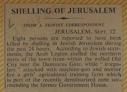 Eight persons are reported to have been killed by shelling in Jewish Jerusalem during the past 24 hours. According to Jewish statements, the Arab Legion shelled the northern parts of the town from within the walled Old City near the Damascus Gate, while “irregulars” attacked with machine-gun and mortar fire a girls’ agricultural training farm which is part of the recently demilitarized zone surrounding the former Government House.