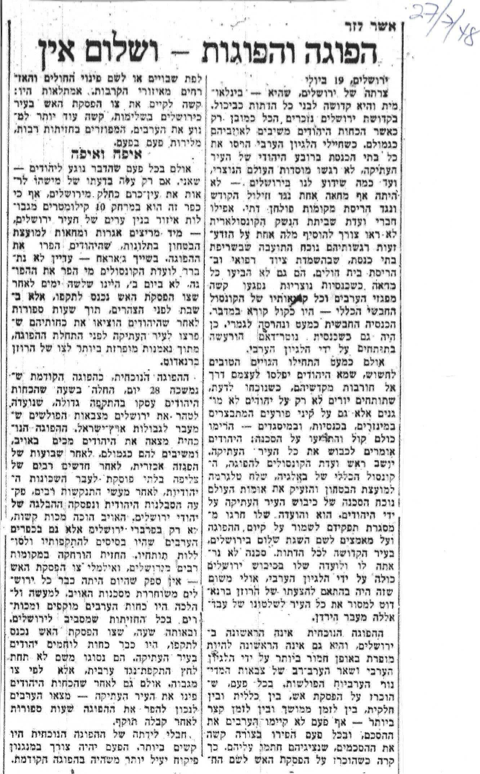 The current truce is not the first in Jerusalem, nor is it the first to be gravely violated by the Arab Legion and the rest of the invading armies of the Arab states. Every time a ceasefire was declared, whether general or partial, long or short-lived, the Arabs never adhered to the agreement. Each time, they severely violated the agreements that their representatives had signed. This happened during ceasefires declared for prisoner exchanges or to evacuate the sick and civilians from battle zones. The excuses were always the same: it was difficult to implement the ceasefire order completely in Jerusalem, and even more difficult to prevent scattered Arab forces from firing intermittently.